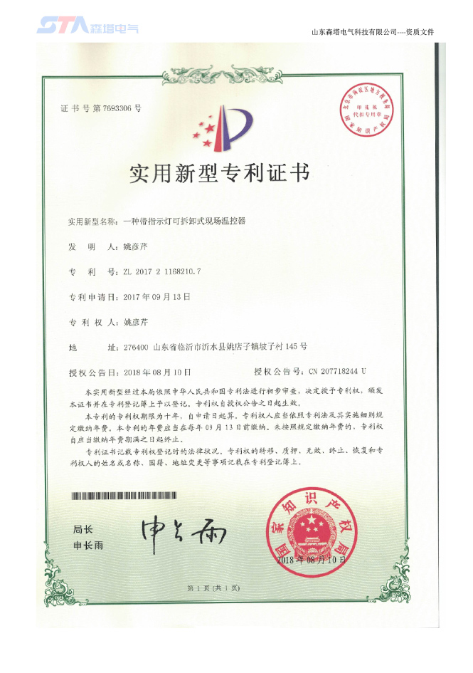 一種帶指示燈可拆卸式現(xiàn)場(chǎng)溫控器實(shí)用新型專利證書